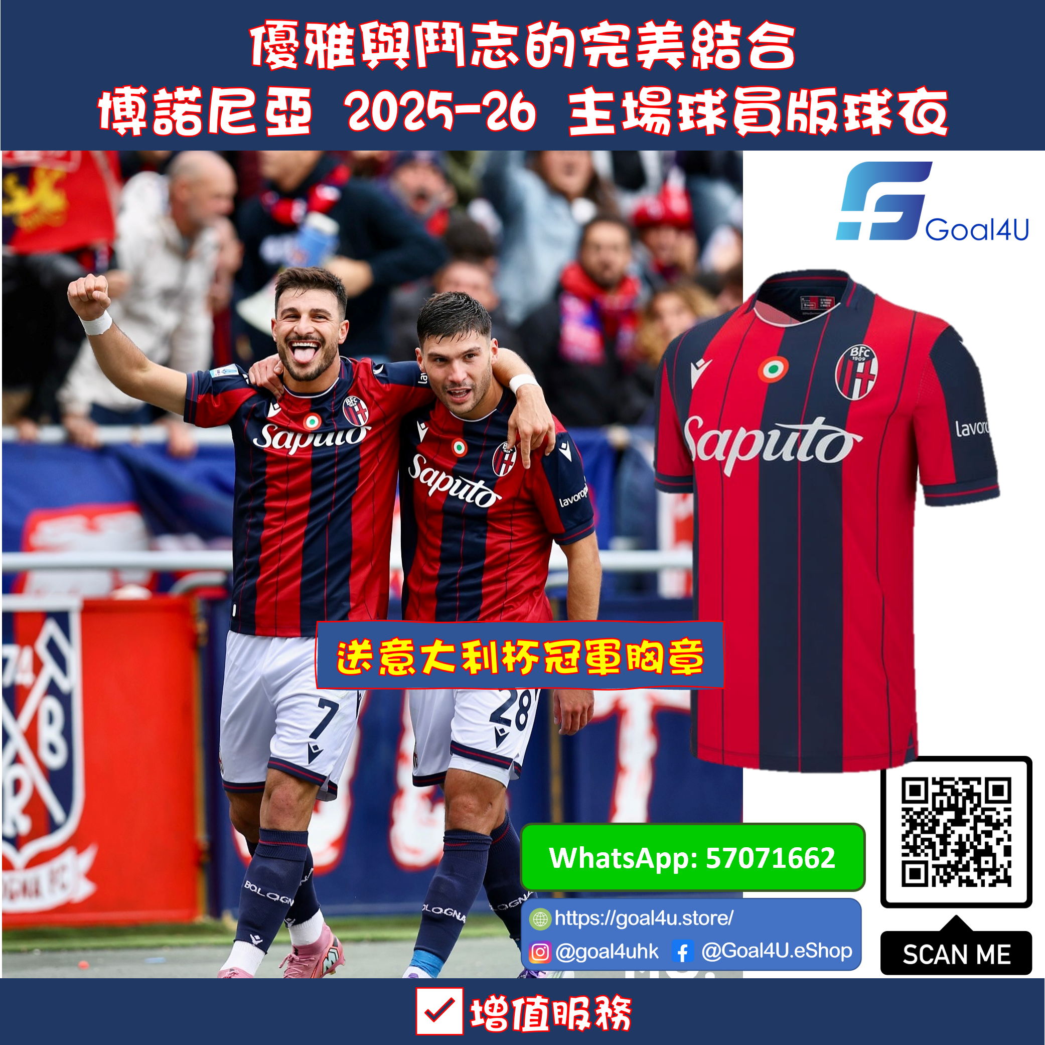 非現貨,預訂約3-4星期到港,敬請留意 🔴🔵 **Bologna FC 1909 2025/26 主場球衣 – 優雅與鬥志的完美結合!** 🔵🔴 這款全新賽季的 **Bologna FC 1909 成人主場球衣**,以經典紅藍直間條紋貫穿設計,將球會的傳統與現代美學完美融合,象徵着紅藍軍團的熱血與榮耀。 簡約的 **圓領剪裁** 配上後領 **專屬熱印細節**,為經典注入時尚氣息。球衣背部採用 **Eco Micromesh 環保透氣布料**,確保運動時的舒適與透氣度;胸前的 **矽膠球會會章**,則象徵球迷與球隊之間的歸屬與自豪。 ❤️💙 **穿上紅藍色,感受球隊的心跳!** 讓這份傳承與熱情,隨每一次呼吸在你體內躍動。 ~呎碼偏修身,建議預大一碼 ~包括意大利杯冠軍胸章 增值服務 ~可加印意甲章 (另外下單 https://www.goal4u.store/i/XwQx5MgAA) ~可加印歐霸章 (另外下單 https://www.goal4u.store/i/V6z8z4gAA) #BolognaFC #WeAreOne #ForzaBologna #SerieA #FootballStyle #Rossoblu #主場球衣 款式一覽 https://goal4u.store/t/Bologna ⚠<注意事項>⚠ - 由於每部電子產品顯示器不同,均存在色差問題,如果對顏色比較在意,請謹慎選購 - 如訂單內包含預訂產品,訂單將於所有貨品到齊後一併發貨 - 除有預訂提示的貨品外,所有貨品均有現貨。確認款項後,1至3工作天內會發貨 - 有預訂提示的貨品,確認款項後,需大約3-4星期訂購到港(Pre-Order預訂產品除外)(以當時購買所顯示預購日子為準) ,如遇上缺貨,將退還已付訂金 - 運送路途遙遠,產品包裝或未處於完美狀態,本店將盡力確保產品完好方會發貨