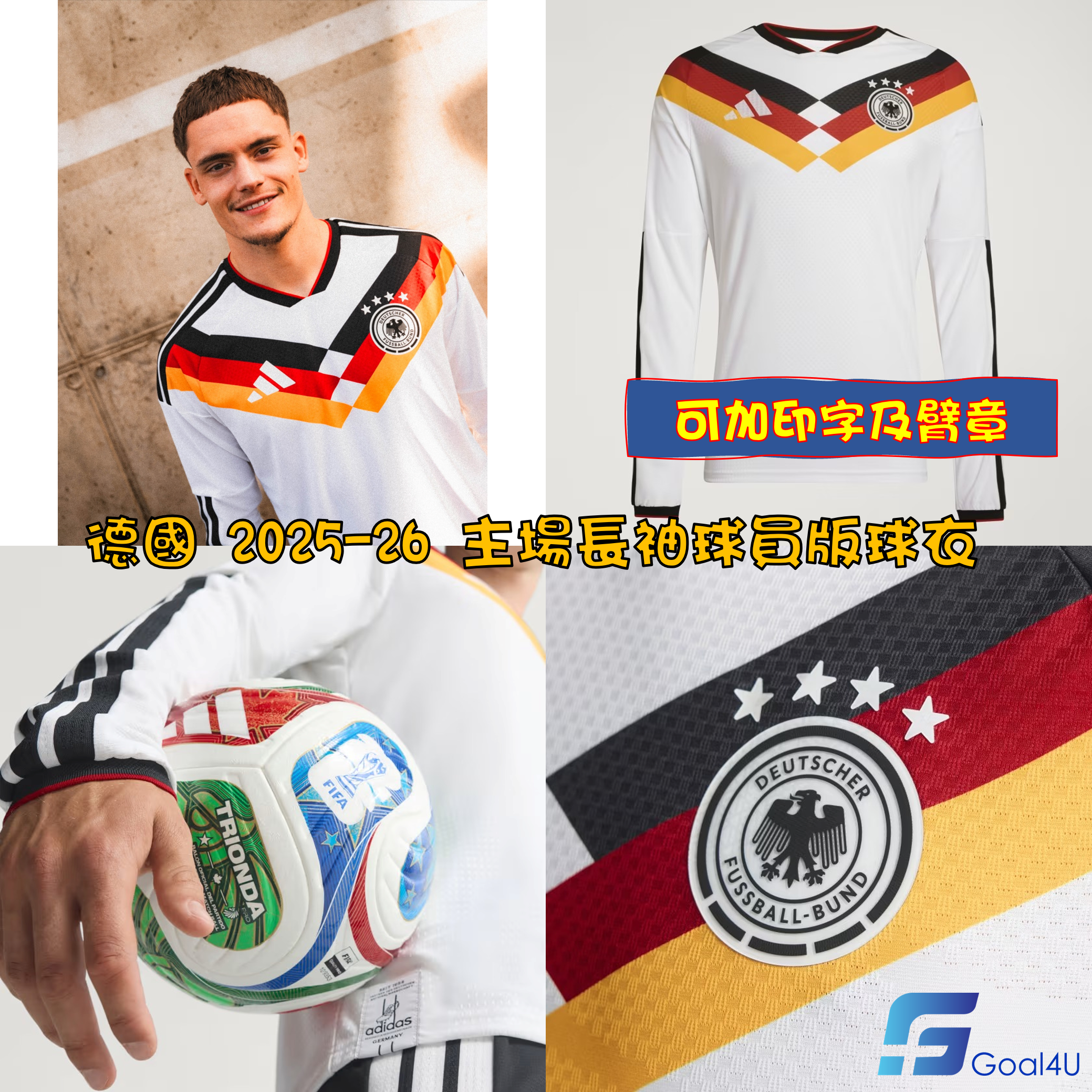 ⚪⚫🟥🟨 向冠軍榮耀致敬的最後戰袍 Adidas Germany 德國 2025-26 主場長袖球員版球衣 (可加印球員印字及臂章) JM1336