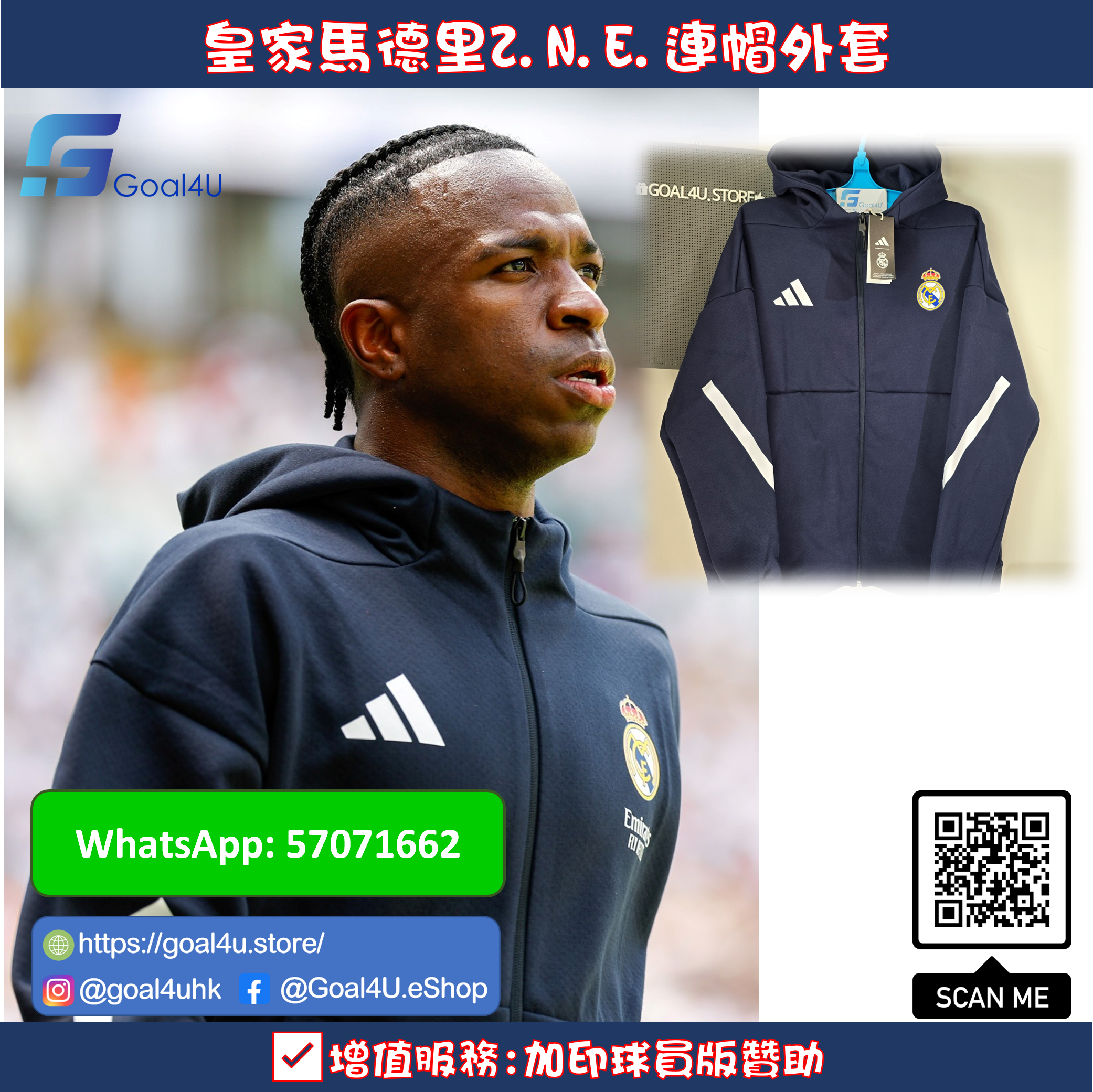 非現貨,預訂約需3-4星期,敬請留意 🖤🧥【皇家馬德里 Z.N.E. 系列球員連帽外套】⚽👑 為一切挑戰做好準備!這款 adidas Z.N.E. 系列連帽外套,正是皇馬球員出場時所穿著的款式,專為保持專注與舒適而設計,展現 Madridistas 的專業風範與榮耀。 💡 柔軟雙面針織布料,有效減低干擾,助你保持冷靜專注 🧥 全拉鏈設計+寬鬆連帽,隨時應對不同天氣 🎨 頭帽印有 Real Madrid 圖案,細節彰顯球會身份 🖐️ 袋鼠口袋設計,方便實用 👕 標準剪裁|黑藍配色(Legend Ink)|皇馬絲印會徽 ♻️ 成分:57% 再生聚酯纖維 + 43% 純棉 🆔 產品編號:KC3739 ✅增值服務:加印球員版贊助(DIY) 💬 無論賽場內外,這款外套都能讓你如同皇馬球員一樣,步步自信! #RealMadrid #皇家馬德里 #ZNESeries #adidasFootball #球員外套 #連帽外套 #皇馬風格 #LegendInk #足球穿搭 #HalaMadrid 款式一覽 https://goal4u.store/t/RealMadrid ⚠<注意事項>⚠ - 由於每部電子產品顯示器不同,均存在色差問題,如果對顏色比較在意,請謹慎選購 - 如訂單內包含預訂產品,訂單將於所有貨品到齊後一併發貨 - 除有預訂提示的貨品外,所有貨品均有現貨。確認款項後,1至3工作天內會發貨 - 有預訂提示的貨品,確認款項後,需大約3-4星期訂購到港(Pre-Order預訂產品除外)(以當時購買所顯示預購日子為準) ,如遇上缺貨,將退還已付訂金 - 運送路途遙遠,產品包裝或未處於完美狀態,本店將盡力確保產品完好方會發貨