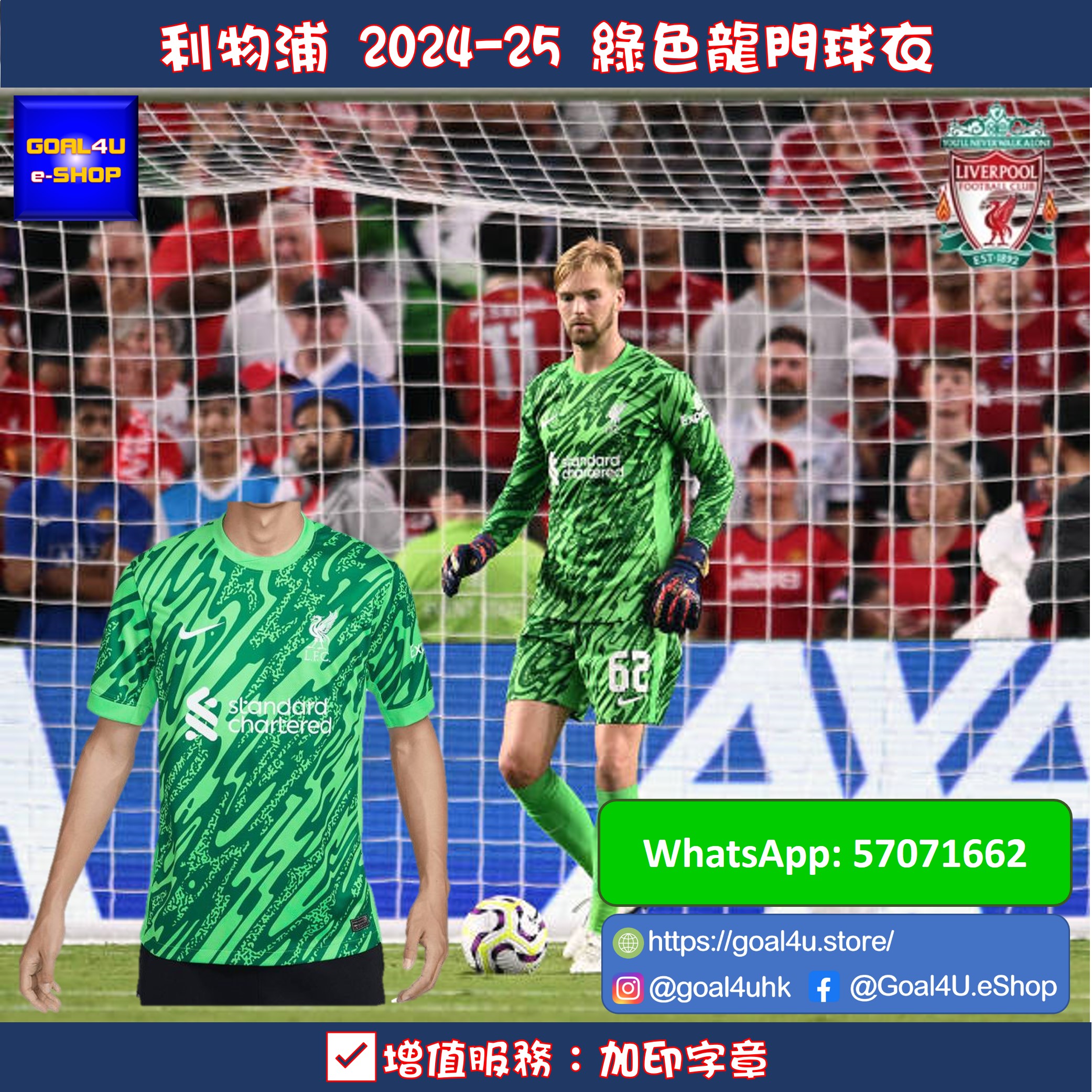 非現貨,預訂約3-4星期左右到港,敬請留意 官方定價£80.00 將設計細節與排汗技術相結合,為您帶來利物浦主場守門員球衣的比賽日造型。Nike Dri-FIT 技術能迅速將汗水從皮膚排走,幫助您保持乾爽和舒適。 附加選項 ~英超字/英超章及反種族歧視章/足總杯臂章 (另購 https://www.goal4u.store/i/SuvFUqgAA) e.g. A. BECKER 1 = 8個字母,1個號碼 (符號以一個字母計算) ~歐聯臂章 (另購 https://bit.ly/3rfhniC) 產品詳情: 100% 聚酯纖維。 可機洗。 產品代碼:FN8802-330 款式一覽 https://goal4u.store/t/Liverpool?cat=all ⚠<注意事項>⚠ - 由於每部電子產品顯示器不同,均存在色差問題,如果對顏色比較在意,請謹慎選購 - 如訂單內包含預訂產品,訂單將於所有貨品到齊後一併發貨 - 除有預訂提示的貨品外,所有貨品均有現貨。確認款項後,1至3工作天內會發貨 - 有預訂提示的貨品,確認款項後,需大約3-4星期訂購到港(Pre-Order預訂產品除外)(以當時購買所顯示預購日子為準) ,如遇上缺貨,將退還已付訂金 - 運送路途遙遠,產品包裝或未處於完美狀態,本店將盡力確保產品完好方會發貨